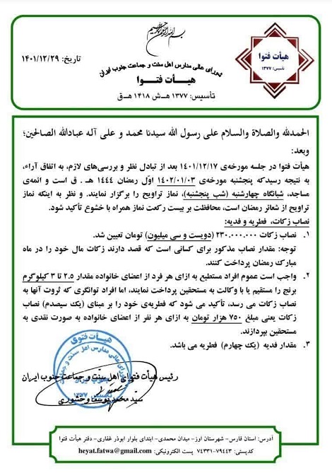 | بیانیه هیئت فتوای اهل سنت جنوب در مورد شروع رمضان و نصاب زکات | خبرها | 3 فروردين 1402 |